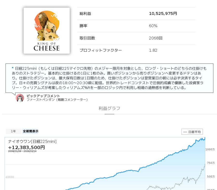 ナイオウワン[日経225mini]は、日経225mini(日経平均先物)を対象としたストラテジーで、hiさんをはじめ他のユーザーさんも多く利用している人気のストラテジーです。