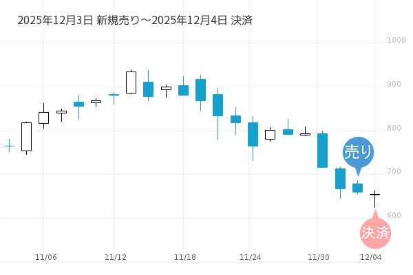 12月3日の朝寄付で新規売りエントリーし、12月4日の朝寄付で決済となり、利回りは+3.7%でした。