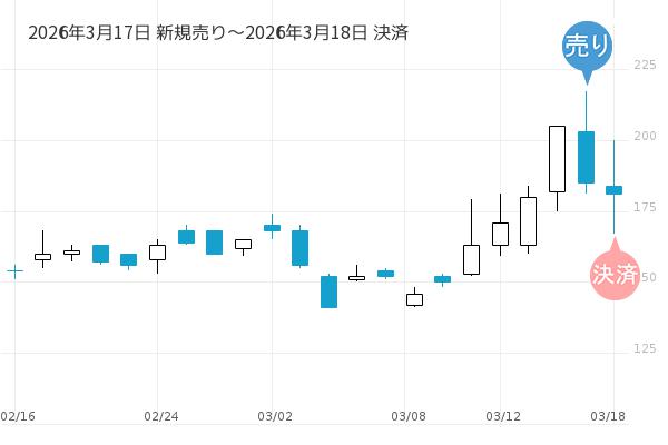 3月17日の朝寄付で新規売りエントリーし、3月18日の朝寄付で決済となり、利回りは+9.4%でした。