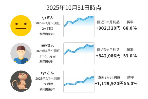 ※利益:実際にユーザーがロボトレーダーから受け取った売買シグナルを元に計算した利益額になります。利益、収益等金額については取引手数料・税金等は考慮しておりません。日々ストラテジーから配信される売買シグナルでは、新規エントリー(買い/売り)、銘柄、数量、そして決済についても明確に記載があります。また注文方法も寄付成行の為、売買シグナルを受け取ったユーザー全員が同じ取引、同じ約定価格を実現できます。
