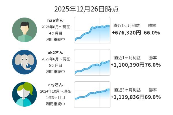 ※利益:実際にユーザーがロボトレーダーから受け取った売買シグナルを元に計算した利益額になります。利益、収益等金額については取引手数料・税金等は考慮しておりません。日々ストラテジーから配信される売買シグナルでは、新規エントリー(買い/売り)、銘柄、数量、そして決済についても明確に記載があります。また注文方法も寄付成行の為、売買シグナルを受け取ったユーザー全員が同じ取引、同じ約定価格を実現できます。