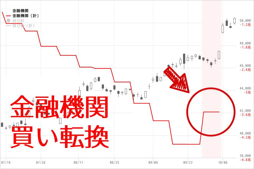 10月第1週、ついに金融機関部門が買いに転じる。25週ぶりの買い越し。