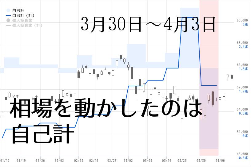 4月第1週となる2026年3月30日~4月3日の週は、前週に比べ、日経平均は250円の下落。その下落相場を作り出したのは、現物先物合計で18,388億円の売り越しをした日銀ETF買い入れを表すと言われている自己計部門。