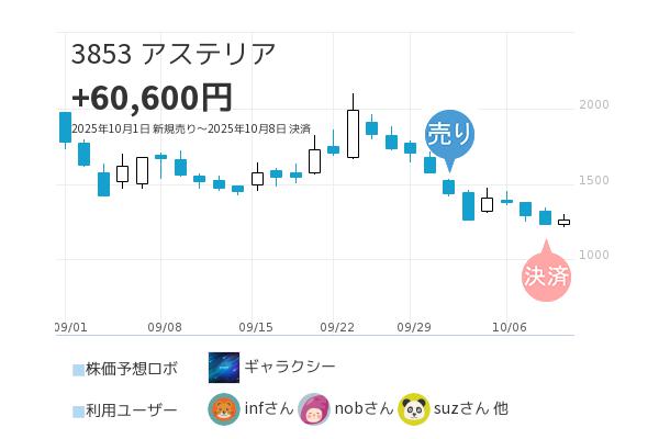 アステリア【3853】の10月1日売りシグナルで利用ユーザーinfさん,nobさん,suzさんが利益確定!