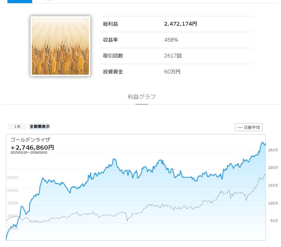 ゴールデンライザは、日本株式銘柄を対象としたストラテジーで、hoさんをはじめ他のユーザーさんも多く利用している人気のストラテジーです。