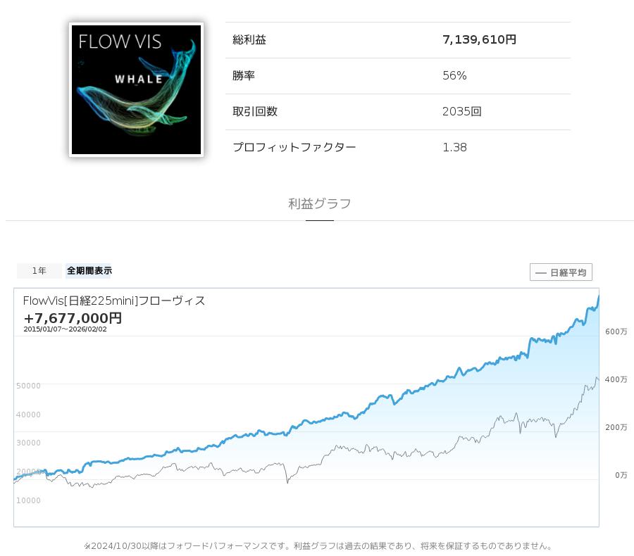 FlowVis[日経225mini]フローヴィスは、日経225mini(日経平均先物)を対象としたストラテジーで、kvさんをはじめ他のユーザーさんも多く利用している人気のストラテジーです。