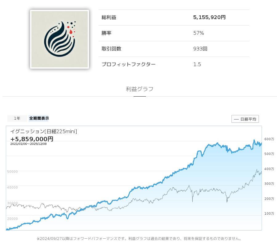 イグニッション[日経225mini]は、日経225mini(日経平均先物)を対象としたストラテジーで、08さんをはじめ他のユーザーさんも多く利用している人気のストラテジーです。