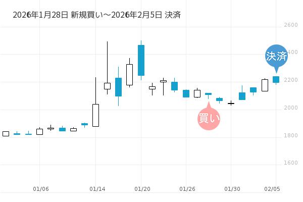 1月28日の朝寄付で新規買いエントリーし、2月5日の朝寄付で決済となり、利回りは+5.8%でした。