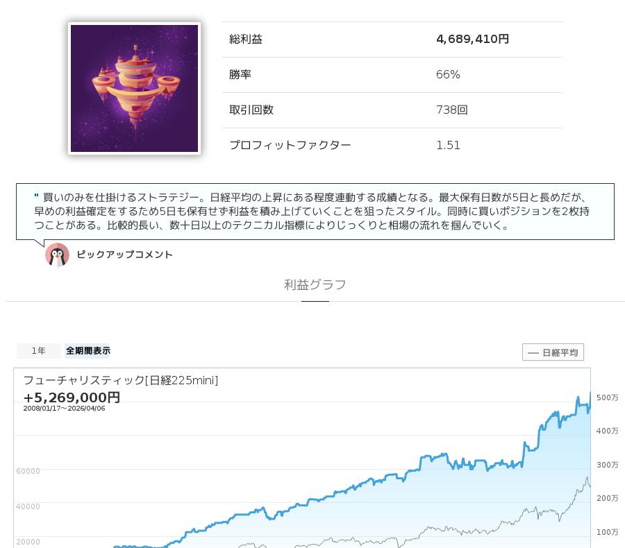 フューチャリスティック[日経225mini]は、日経225mini(日経平均先物)を対象としたストラテジーです。