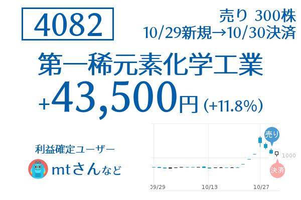 10月30日に4082:第一稀元素化学工業の取引で+43,500円の利益を確定しました。