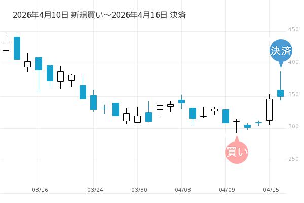 4月10日の朝寄付で新規買いエントリーし、4月16日の朝寄付で決済となり、利回りは+15.8%でした。