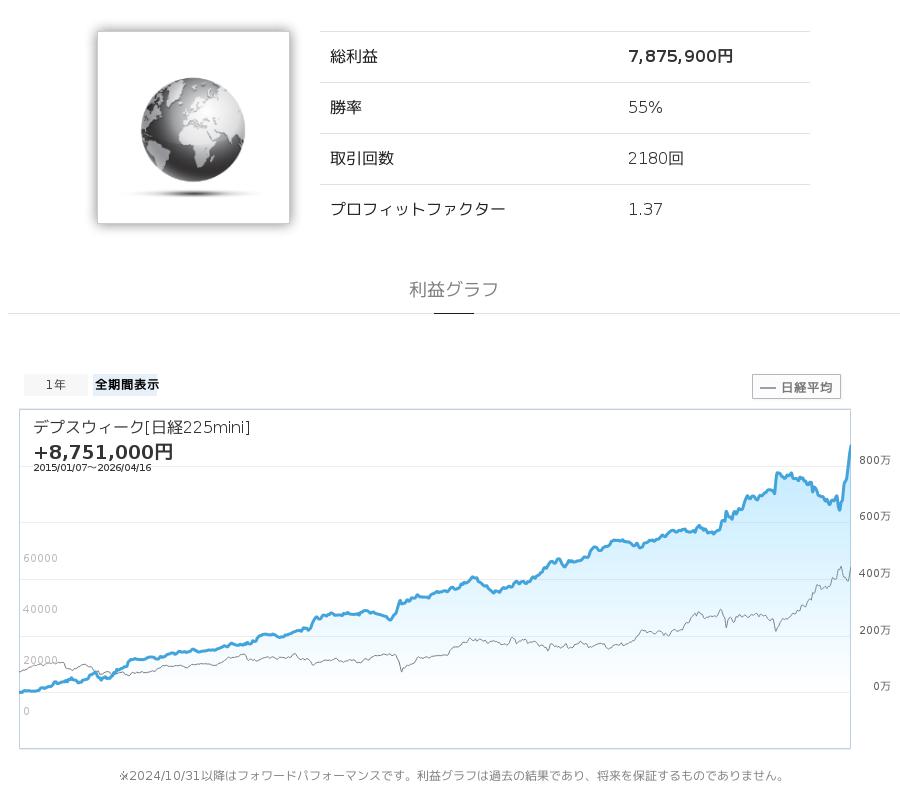 ロボトレーダーのストラテジー「デプスウィーク[日経225mini]」+1,877,500円!30日間の実績※(4月16日時点)