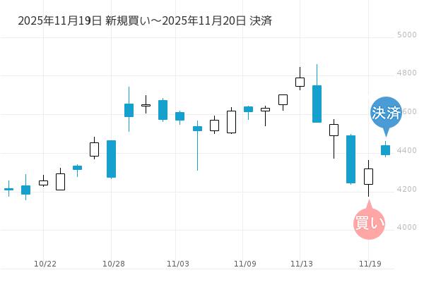 11月19日の朝寄付で新規買いエントリーし、11月20日の朝寄付で決済となり、利回りは+4.8%でした。