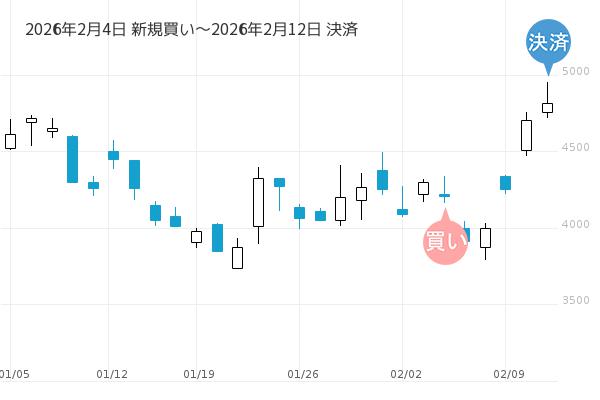 2月4日の朝寄付で新規買いエントリーし、2月12日の朝寄付で決済となり、利回りは+12.7%でした。