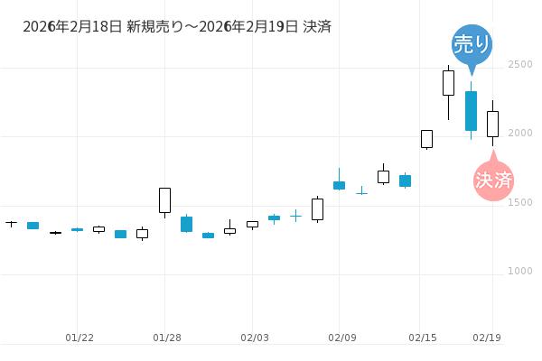 2月18日の朝寄付で新規売りエントリーし、2月19日の朝寄付で決済となり、利回りは+14.0%でした。