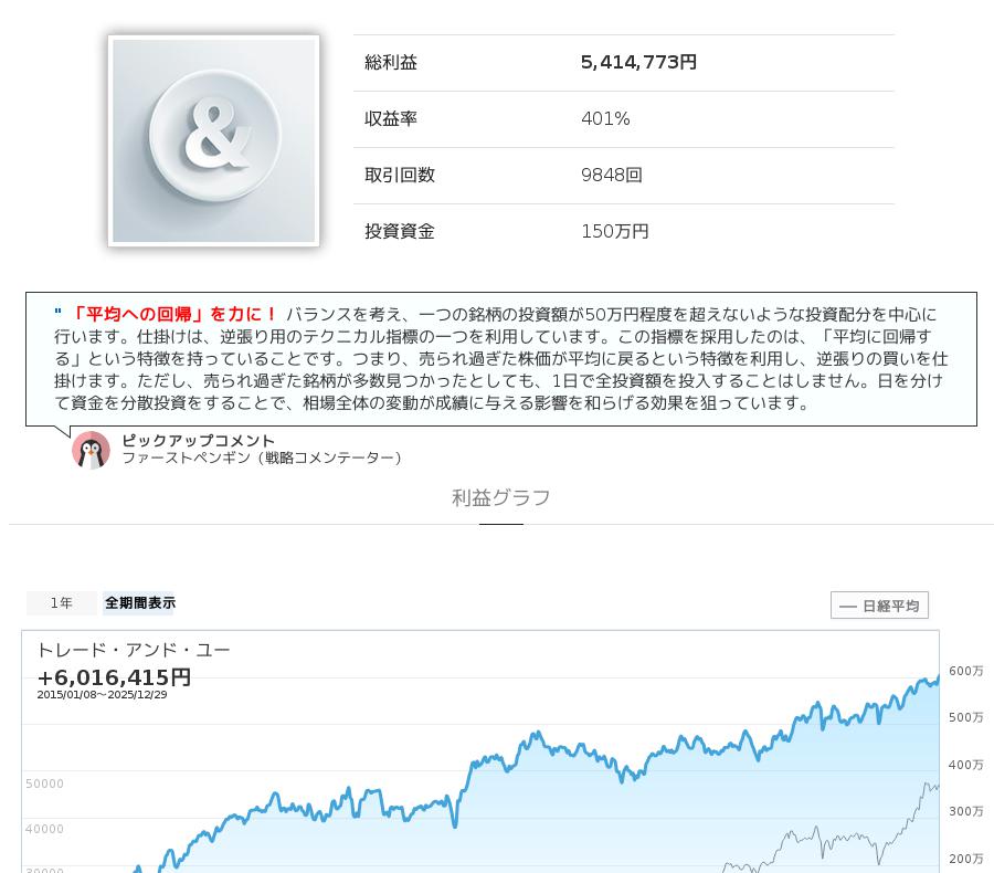 トレード・アンド・ユーは、日本株式銘柄を対象としたストラテジーで、moさんをはじめ他のユーザーさんも多く利用している人気のストラテジーです。