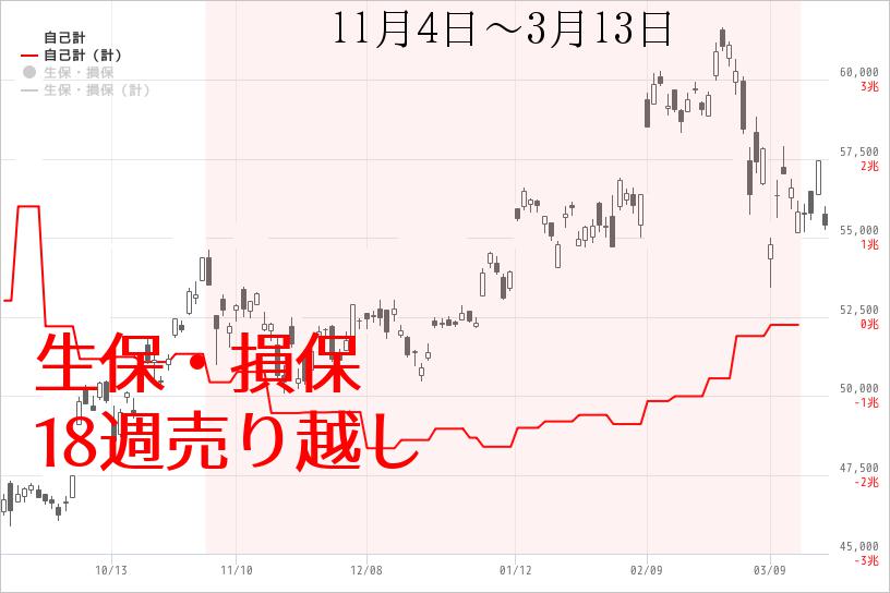 対抗するのは「日銀ETF買い入れを表すと言われている自己計部門」で、5週連続で買い越し(合計1.3兆円)である。