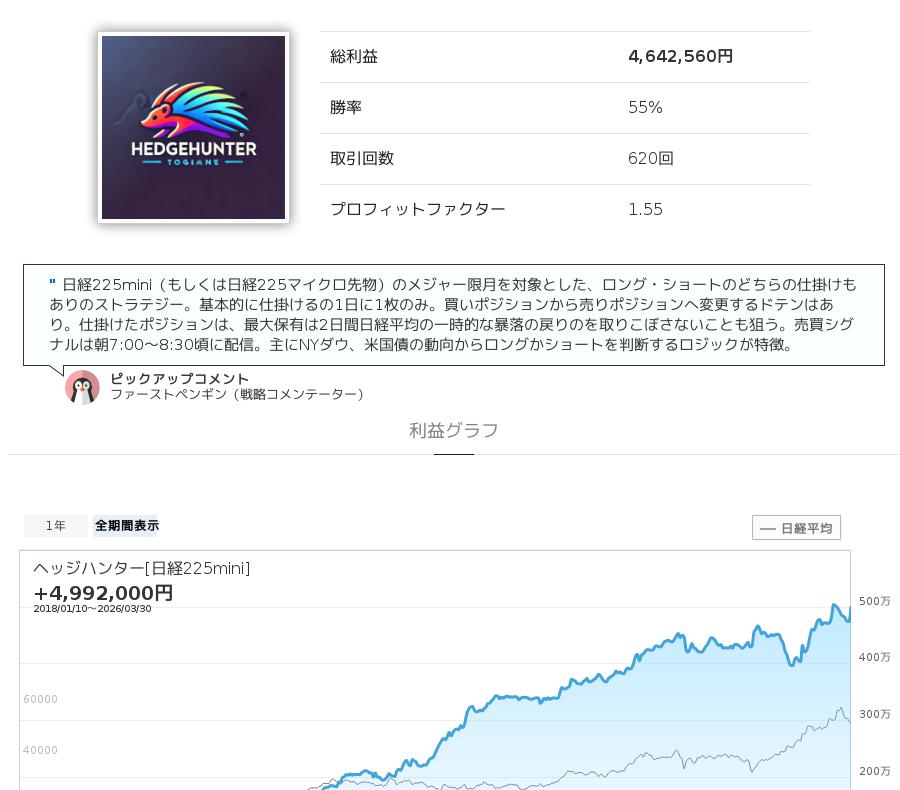 ヘッジハンター[日経225mini]は、日経225mini(日経平均先物)を対象としたストラテジーです。