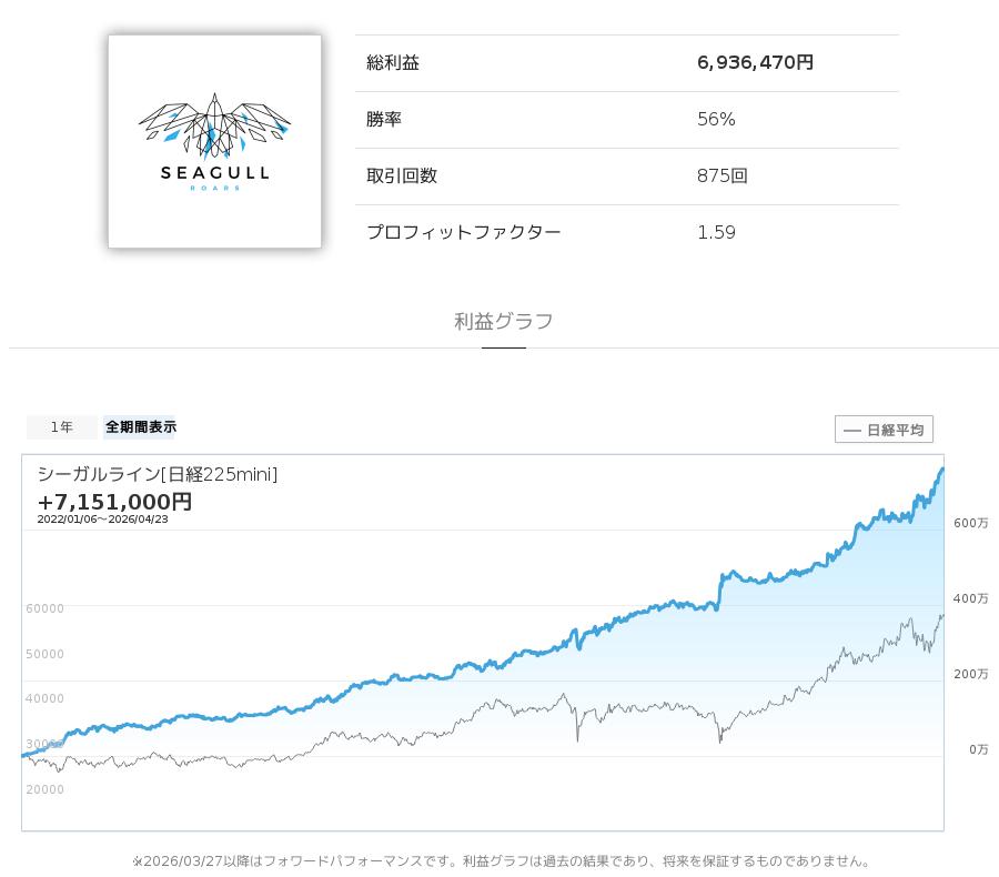 ロボトレーダーのストラテジー「シーガルライン[日経225mini]」+717,500円!30日間の実績※(4月23日時点)