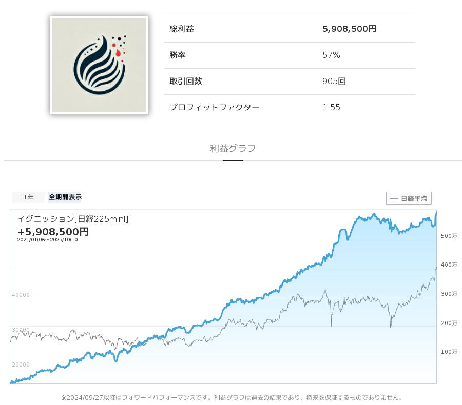 イグニッション[日経225mini]は、日経225mini(日経平均先物)を対象としたストラテジーで、tyさんをはじめ他のユーザーさんも多く利用している人気のストラテジーです。