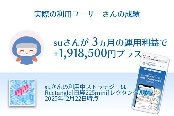 suさんは、ロボトレーダーを2025年4月に利用開始し、利用9ヶ月になるユーザーさん。日経平均先物をメインとした運用方針で、日経225mini専用のストラテジーを利用しています。