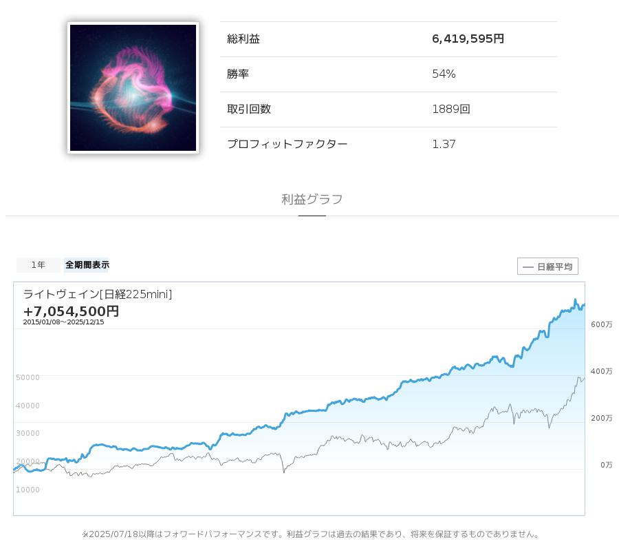 ライトヴェイン[日経225mini]は、日経225mini(日経平均先物)を対象としたストラテジーで、keさんをはじめ他のユーザーさんも多く利用している人気のストラテジーです。