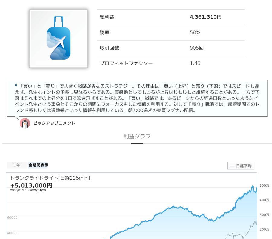 トランクライドライト[日経225mini]は、日経225mini(日経平均先物)を対象としたストラテジーです。