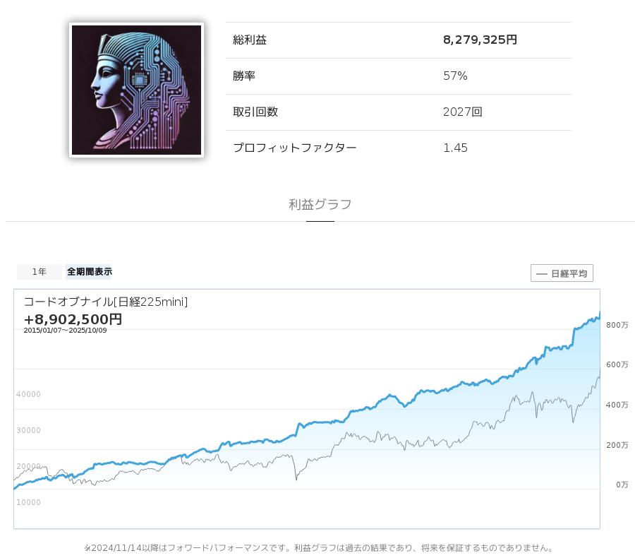 ロボトレーダーのストラテジー「コードオブナイル[日経225mini]」+539,000円!30日間の実績※(10月9日時点)