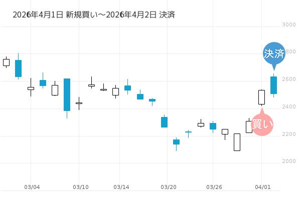 4月1日の朝寄付で新規買いエントリーし、4月2日の朝寄付で決済となり、利回りは+8.3%でした。