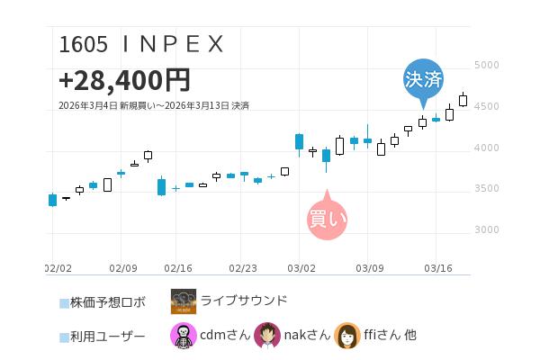 | 2023/12/28 | -5,600円 | INPEX | 買 | 200 | 1,943円 | 1,915円 |