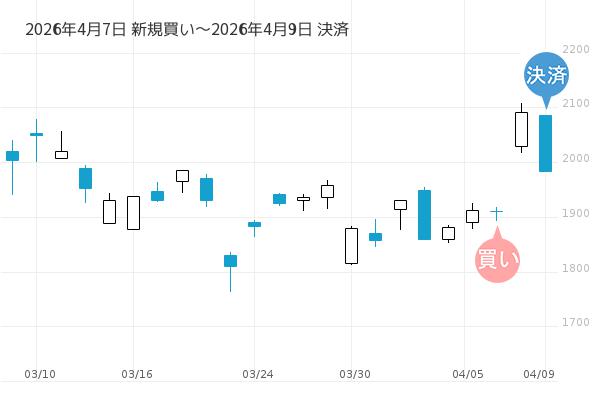 4月7日の朝寄付で新規買いエントリーし、4月9日の朝寄付で決済となり、利回りは+9.2%でした。