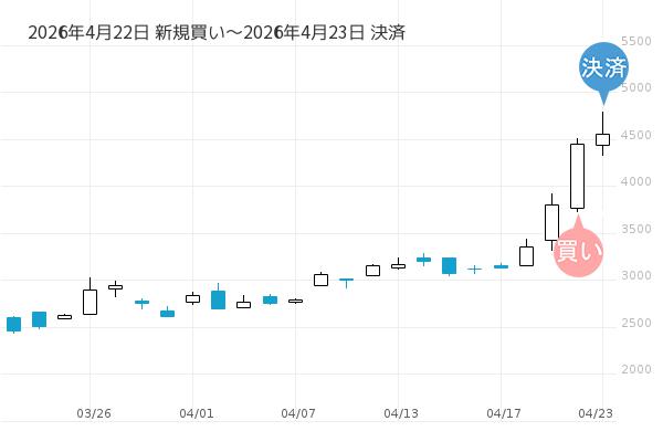4月22日の朝寄付で新規買いエントリーし、4月23日の朝寄付で決済となり、利回りは+17.9%でした。