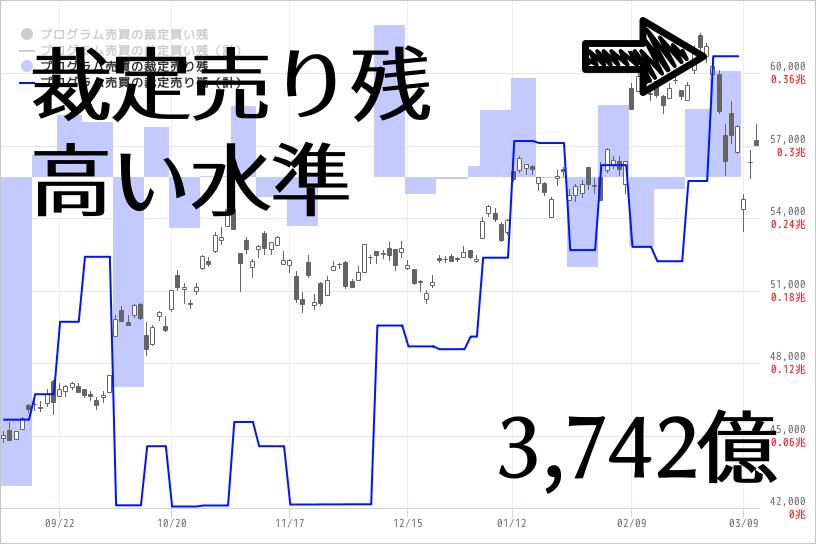プログラム売買の裁定取引において「先物買い・現物空売り」が多く行われてきており、まだ決済(裁定の解消)されてない額が994億円存在している。 現物が割高で、先物が割安ということなので、一般的に短期的には下落予測と考えられる。 対して、将来においては994億円まで積み上がった売りは、買い戻されることになるため、株価上昇の要因でもある。 買っていた先物を決済すると同時に現物を買い戻す必要がある為、先物のSQ日寄付やSQ前日などに大きな買い圧力となることがある。