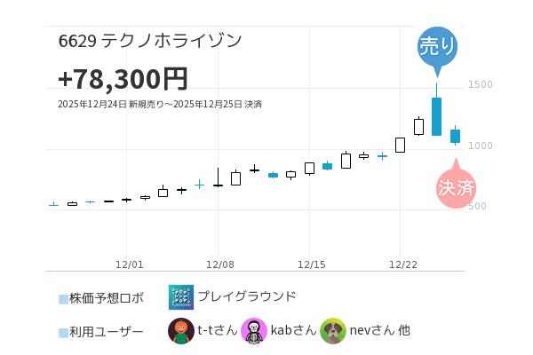 テクノホライゾン【6629】12月24日売りシグナル点灯!12月25日決済シグナルで+78,300円