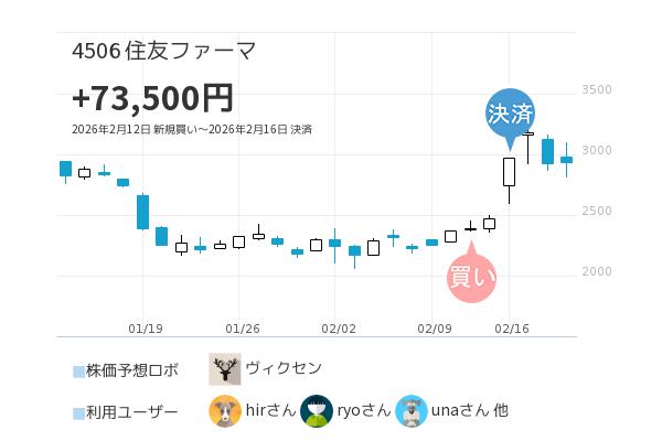 住友ファーマ【4506】2月12日買いシグナル点灯!2月16日決済シグナルで+73,500円