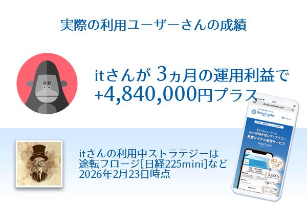 ※利益:実際にユーザーがロボトレーダーから受け取った売買シグナルを元に計算した利益額になります。利益、収益等金額については取引手数料・税金等は考慮しておりません。日々ストラテジーから配信される売買シグナルでは、新規エントリー(買い/売り)、銘柄、数量、そして決済についても明確に記載があります。また注文方法も寄付成行の為、売買シグナルを受け取ったユーザー全員が同じ取引、同じ約定価格を実現できます。
