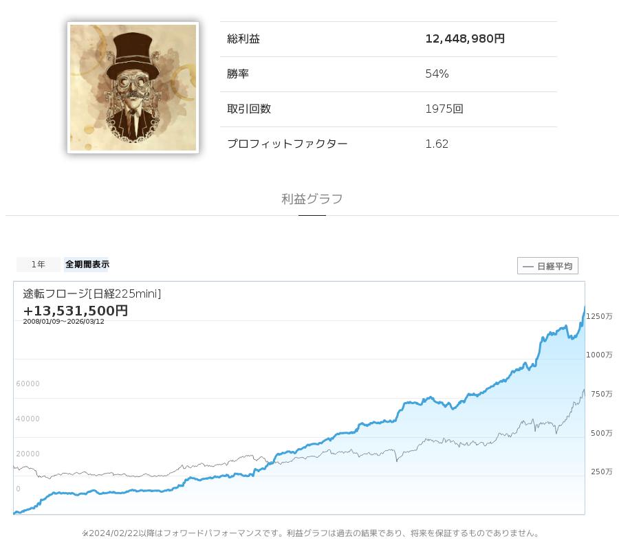 ロボトレーダーのストラテジー「途転フロージ[日経225mini]」+1,430,000円!30日間の実績※(3月12日時点)