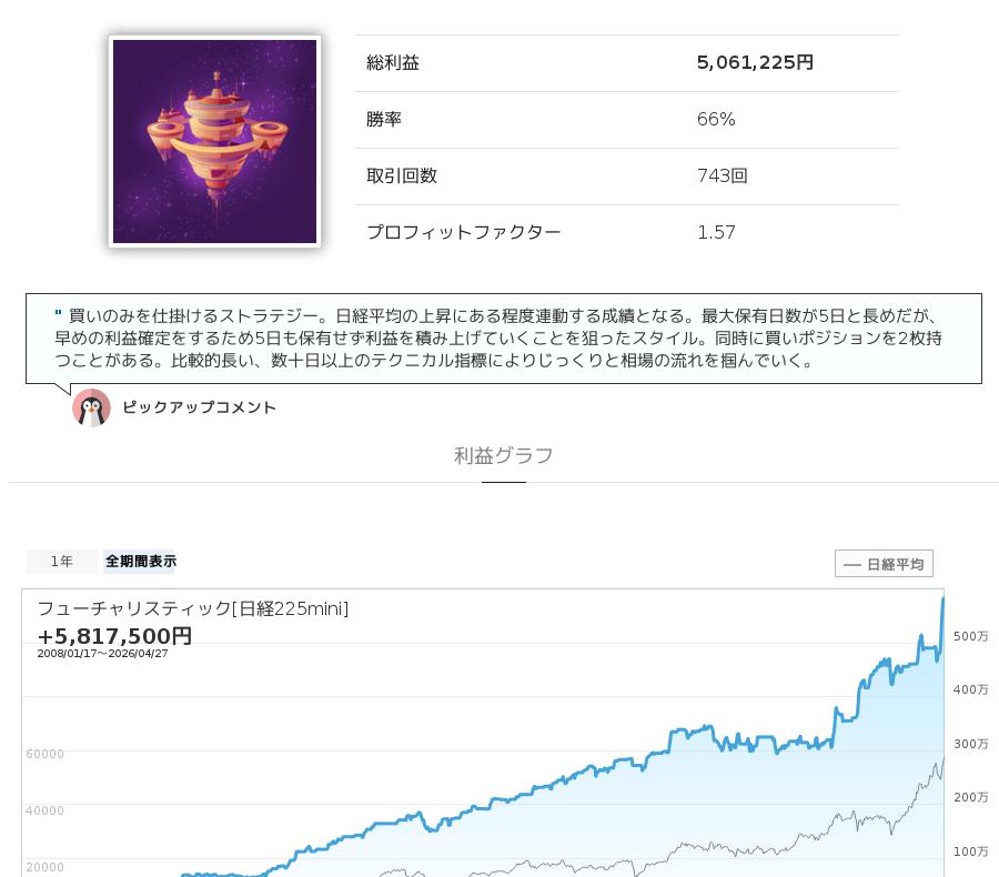 フューチャリスティック[日経225mini]は、日経225mini(日経平均先物)を対象としたストラテジーで、tiさんをはじめ他のユーザーさんも多く利用している人気のストラテジーです。
