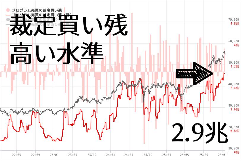 プログラム売買の裁定取引において「先物買い・現物空売り」が多く行われてきており、まだ決済(裁定の解消)されてない額が2,074億円存在している。 現物が割高で、先物が割安ということなので、一般的に短期的には下落予測と考えられる。 対して、将来においては2,074億円まで積み上がった売りは、買い戻されることになるため、株価上昇の要因でもある。 買っていた先物を決済すると同時に現物を買い戻す必要がある為、先物のSQ日寄付やSQ前日などに大きな買い圧力となることがある。