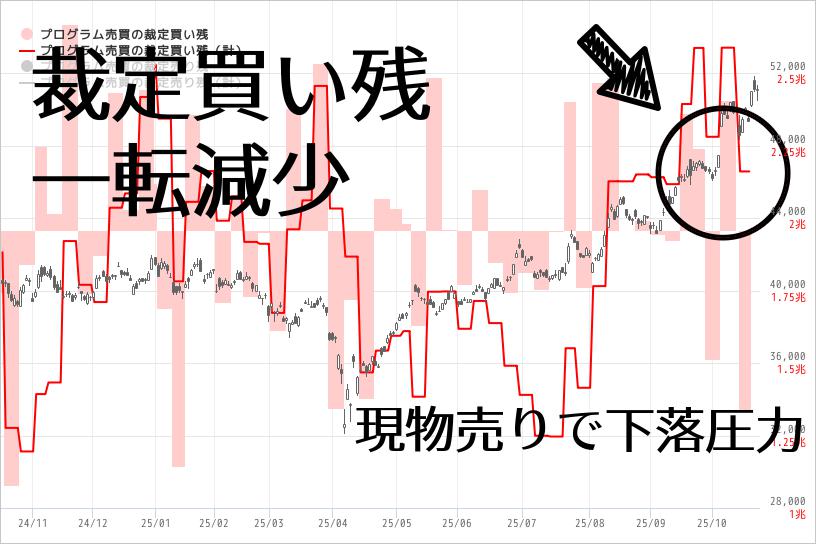 「先物売り・現物買い」のセットで構成される裁定買いポジションを解消するために、先物を決済すると同時に現物の売りが進んだ。 このまま、裁定の解消が進めば、現物の売りが継続し、相場には下落圧力となる。