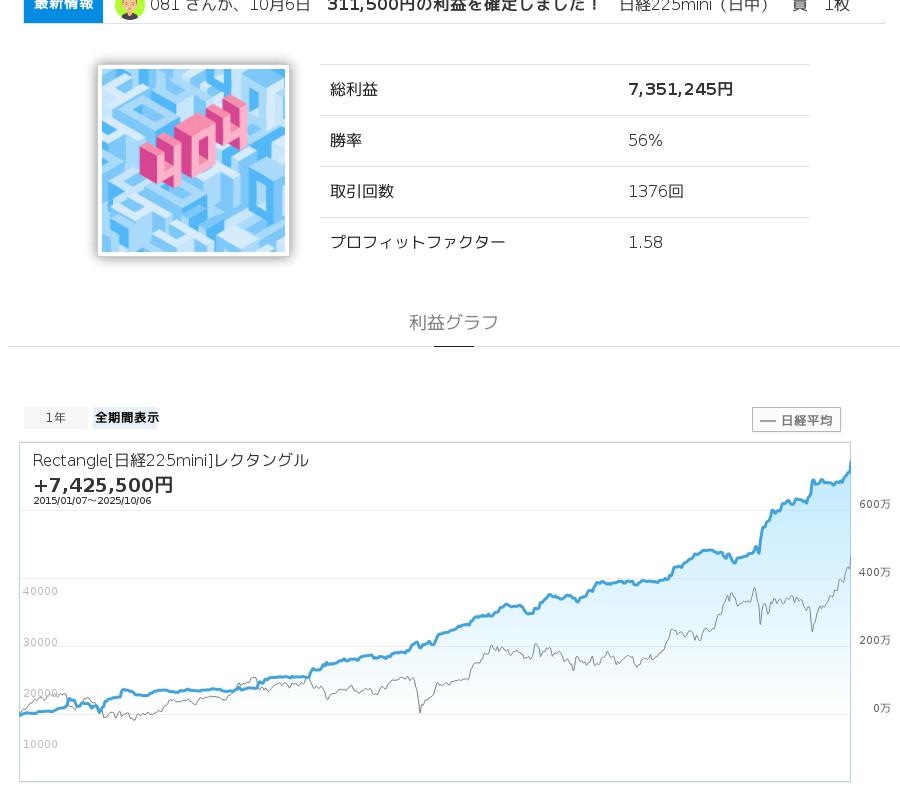 レクタングルは、日経225mini(日経平均先物)を対象としたストラテジーで、suさんをはじめ他のユーザーさんも多く利用している人気のストラテジーです。
