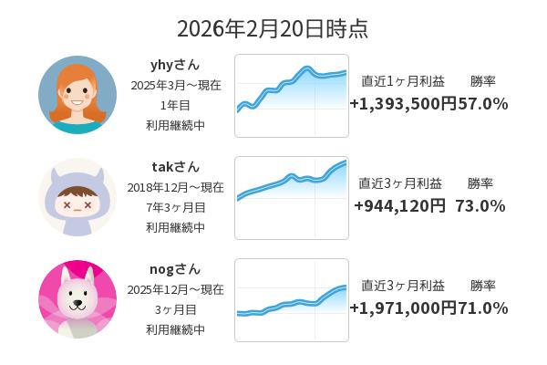 ※利益:実際にユーザーがロボトレーダーから受け取った売買シグナルを元に計算した利益額になります。利益、収益等金額については取引手数料・税金等は考慮しておりません。日々ストラテジーから配信される売買シグナルでは、新規エントリー(買い/売り)、銘柄、数量、そして決済についても明確に記載があります。また注文方法も寄付成行の為、売買シグナルを受け取ったユーザー全員が同じ取引、同じ約定価格を実現できます。