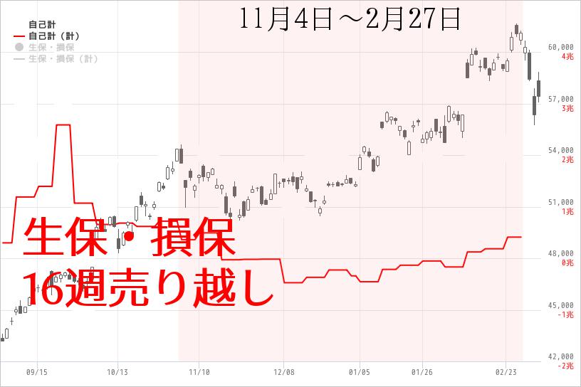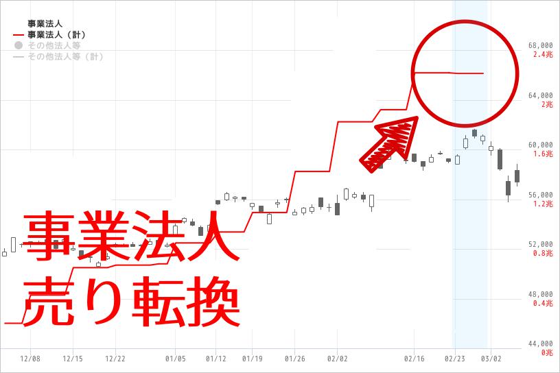 2月第4週、ついに上場企業による自社株買いとみられる事業法人部門が売りに転じる。22週ぶりの売り越し。