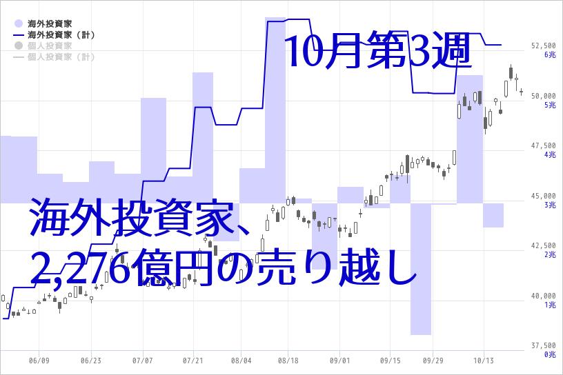 海外投資家が売り越しする中、10月第3週に、買い越しに回り海外投資家の売り越し分を吸収した部門は、「個人投資家部門」で約4,591億円の買い越しとなった。