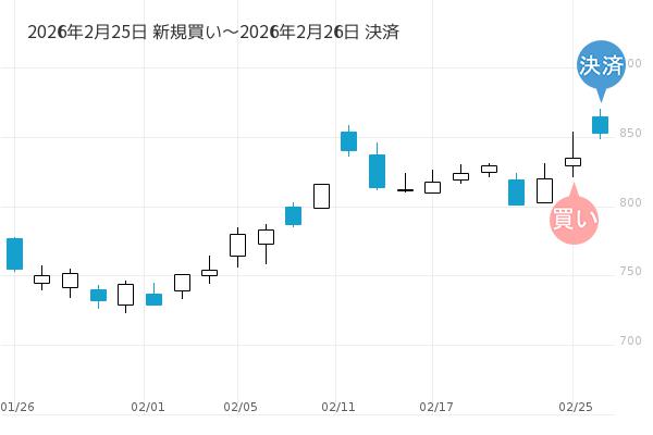 2月25日の朝寄付で新規買いエントリーし、2月26日の朝寄付で決済となり、利回りは+4.3%でした。