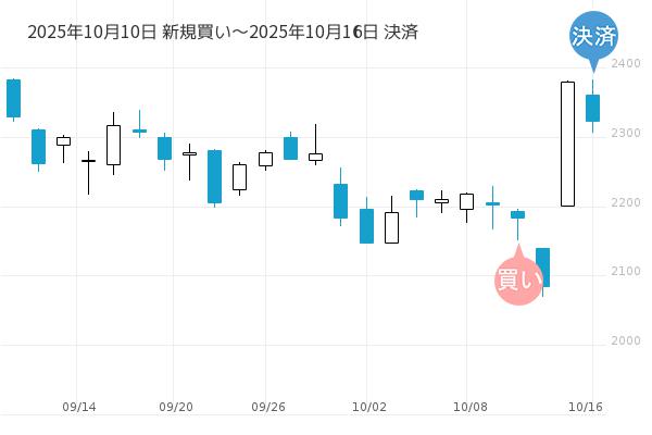 10月10日の朝寄付で新規買いエントリーし、10月16日の朝寄付で決済となり、利回りは+7.7%でした。