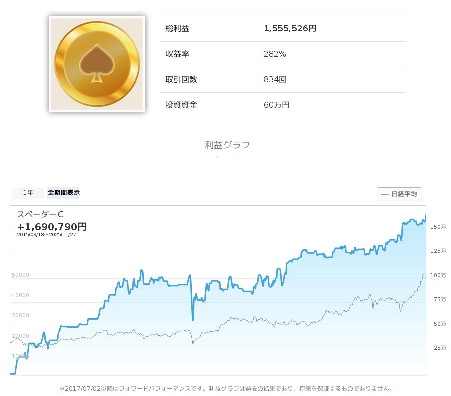 今回の売買シグナルを配信した株価予想ロボ(ストラテジー)の「スペーダーC」は、