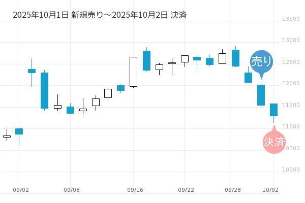 10月1日の朝寄付で新規売りエントリーし、10月2日の朝寄付で決済となり、利回りは+3.6%でした。