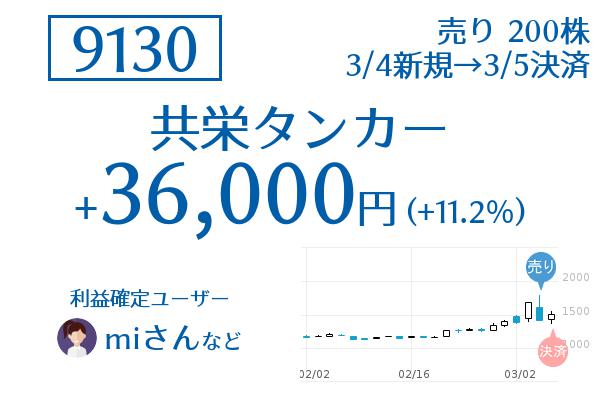 9130:共栄タンカー 3月4日売り+36,000円(+11.2%)